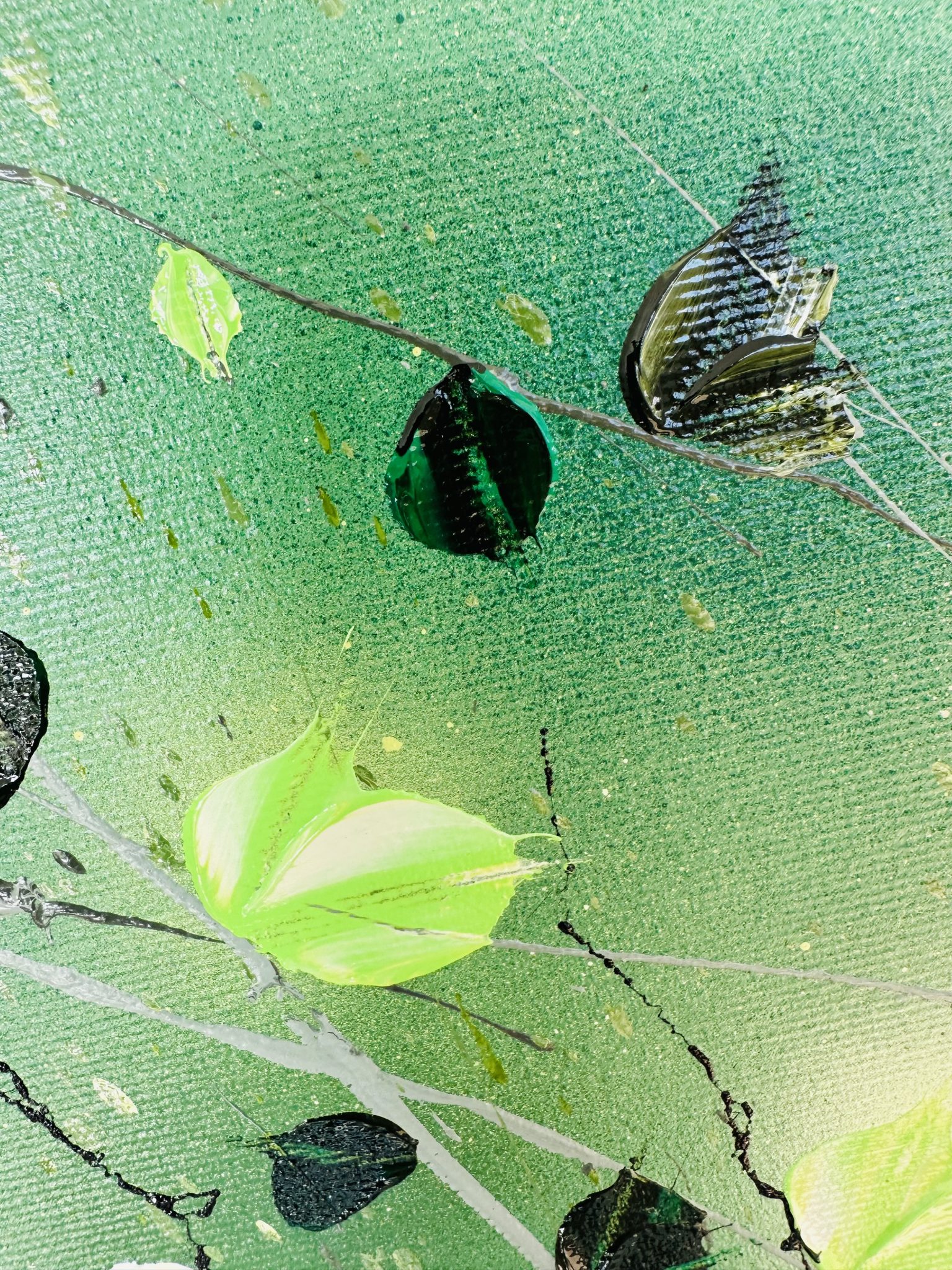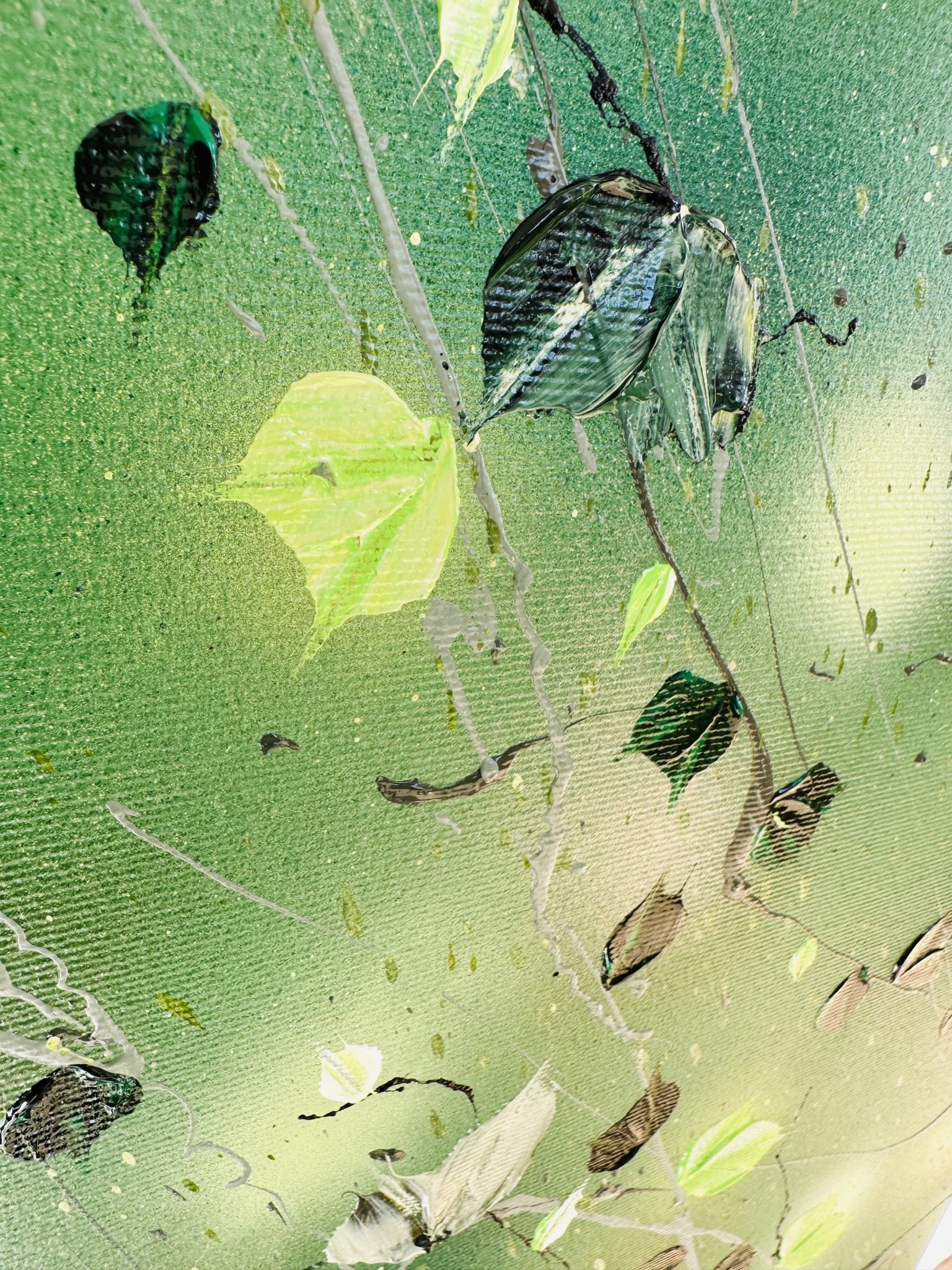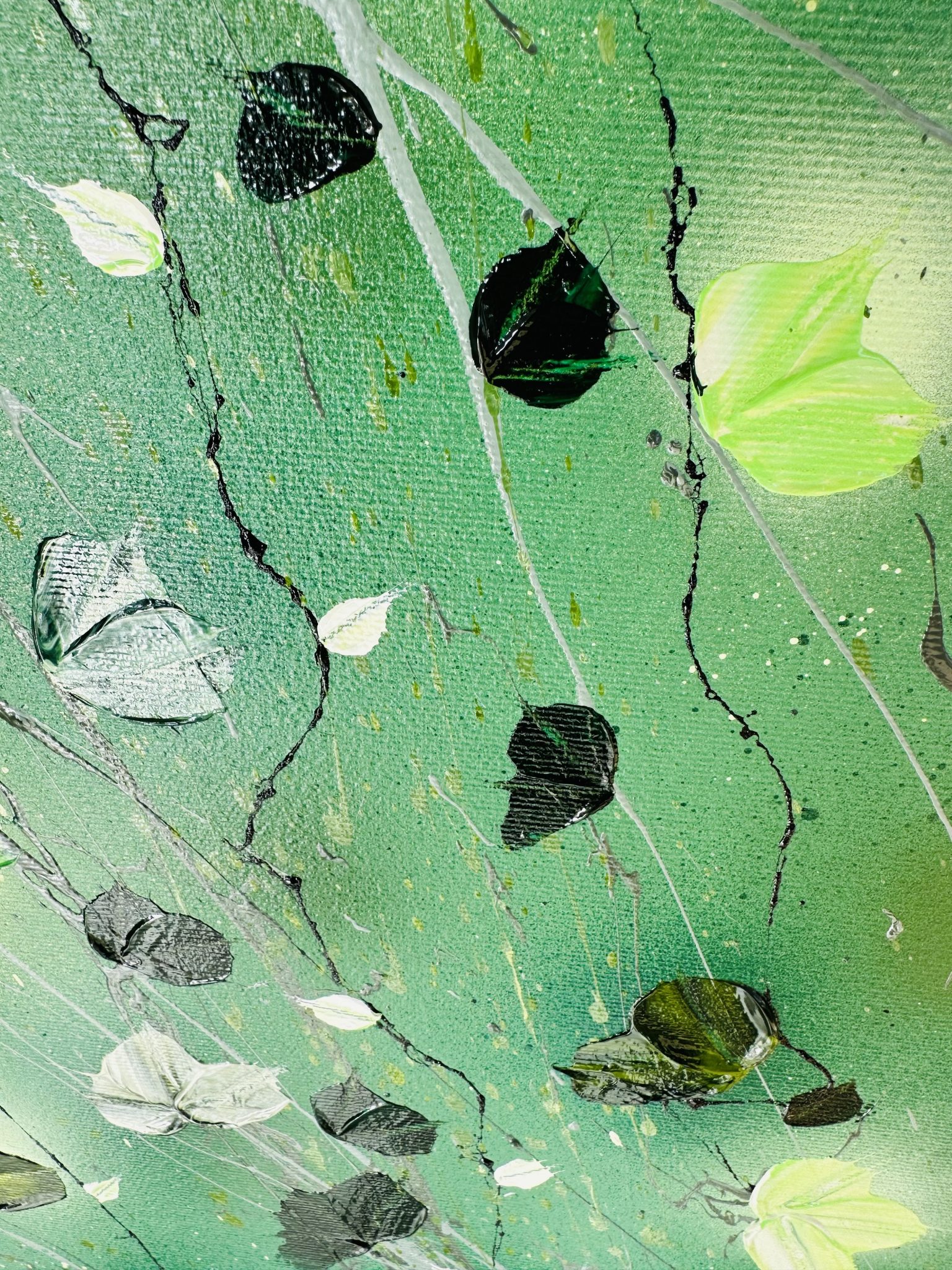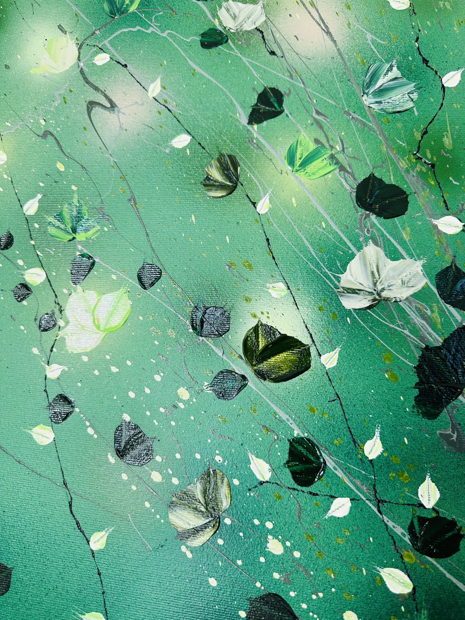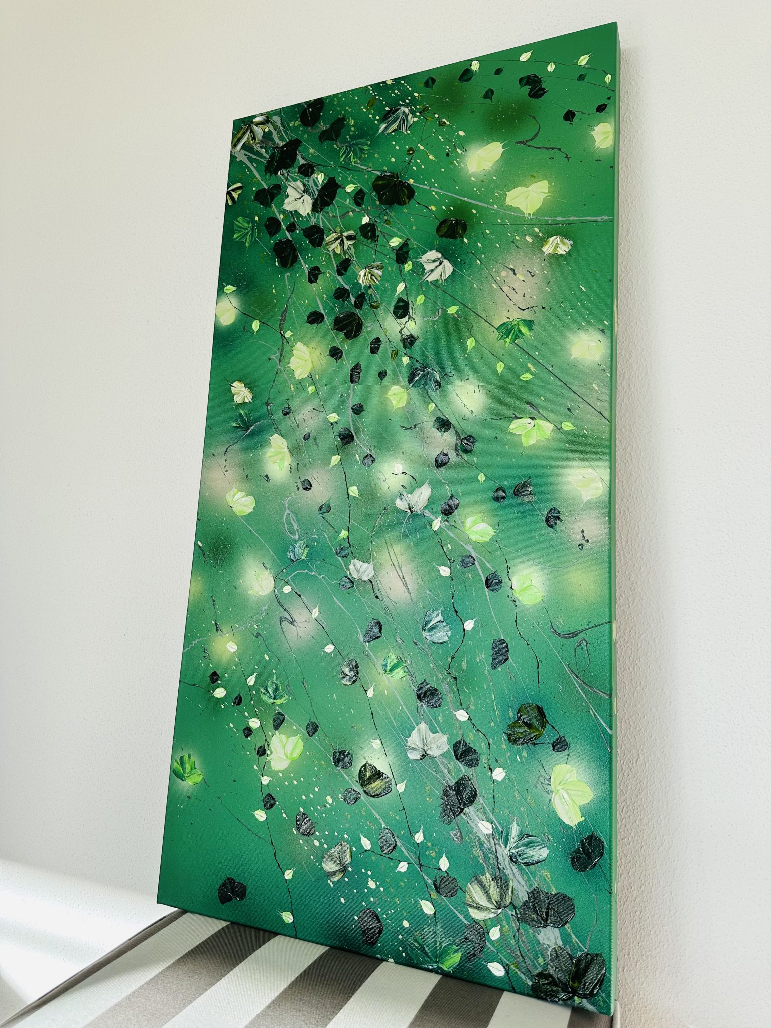Diese beeindruckende Komposition wurde mit professionellen Acrylfarben erschaffen. Ihre lebendigen Farben und organische Formen machen sie zu einer idealen Ergänzung sowohl für moderne als auch klassische Einrichtungen. Das beruhigende Grün der Natur verströmt Harmonie und schafft eine ruhige Atmosphäre im Raum.